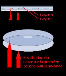 Les DVD double couche sont constitués d'une couche translucide semi réfléchissante à base d'or et d'une couche réflexive opaque à base d'argent, séparées par une couche de liaison. Pour lire ces deux couches le lecteur dispose d'un laser pouvant changer d'intensité en modifiant sa fréquence et sa focale.